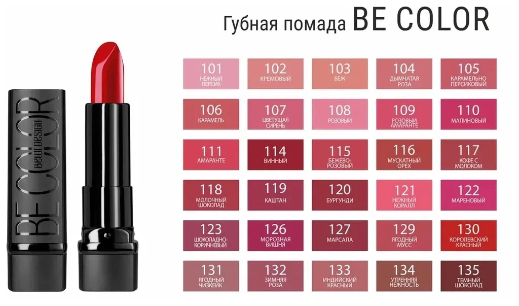 Губная помада BE COLOR с нежной кремовой текстурой имеет насыщенный цвет и глянцевый блеск, обладает плотным покрытием. Содержит белый пчелиный воск, канделлильский и карнаубский воски, масло жожоба, касторовое масло и витамин Е для питания и увлажнения. Невероятно комфортна на губах.