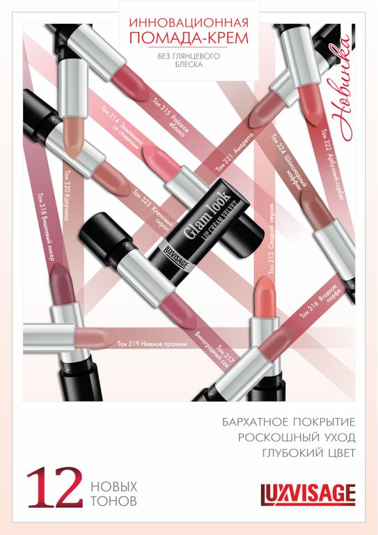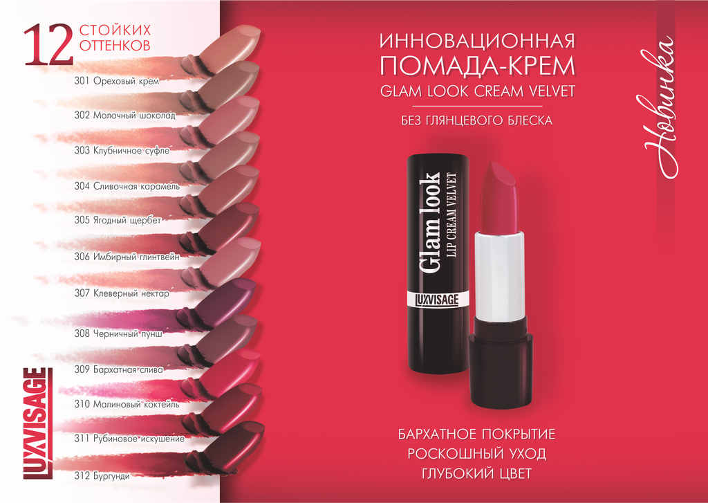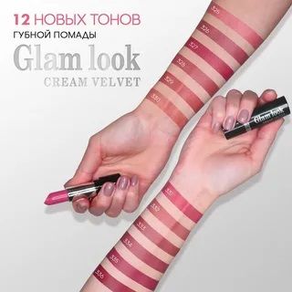 Новая помада Glam Look cream velvet - изысканное предложение для тех, кто любит помады без глянцевого блеска. Кремовая текстура, бархатный финиш, 12 роскошных оттенков - в этой помаде есть все,чтобы соответствовать модным тенденциям в мире декоративной косметики.