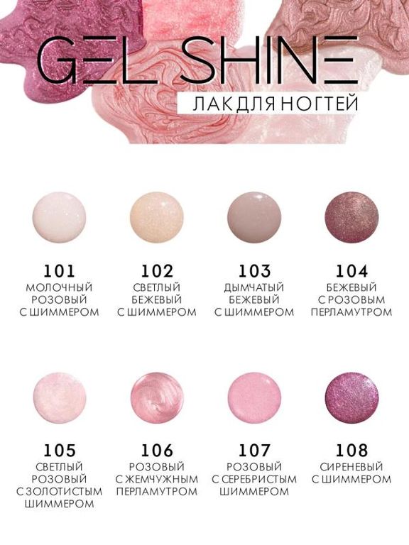 Лак для ногтей GEL SHINE с разнообразным жемчужным перламутром и сияющим шиммером. Суперстойкое глянцевое покрытие сохраняет блеск и сияние, продержится без сколов на ногтях до 5 дней. Быстросохнущая формула и широкая салонная кисть для быстрого и равномерного нанесения лака без полос и разводов. Cтойкий перламутровый лак для ногтей GEL SHINE создает восхитительные переливы на ногтях. Безопасная формула «5FREE»: не содержит толуол, формальдегид, формальдегидные смолы, камфору, дибутилфталат.