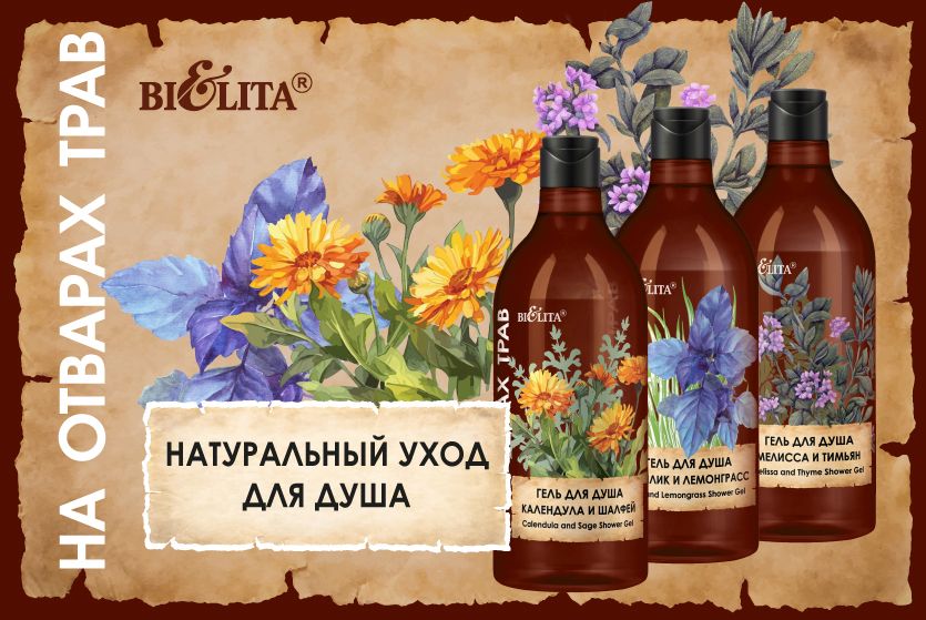 Представляем вам новую косметическую линию гелей для душа - «НА ОТВАРАХ ТРАВ». Эта коллекция создана с использованием натуральных трав и экстрактов: мелиссы, тимьяна, базилика, лемонграсса, календулы и шалфея, чтобы подарить вашей коже не только очищение, но и невероятное ощущение свежести и ухода.