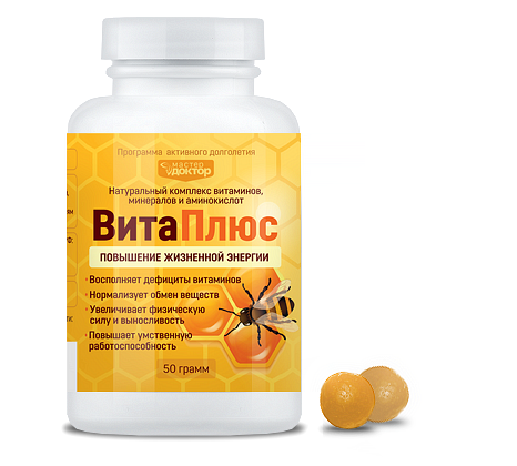 Драже ВитаПлюс - 100% натуральный комплекс, созданный на основе цветочной пыльцы. Содержит в своём составе витамины А, C, Е, D, P, К, группы B, макро и микроэлементы, протеины и свободные аминокислоты, фитогормоны, ферменты, природные антибиотики и другие группы биологически активных веществ. Вещества, входящие в состав продукта ВитаПлюс оказывают мощнейшее регуляторное действие на огромное количество физиологических процессов, протекающих в организме человека, приводя их в норму.